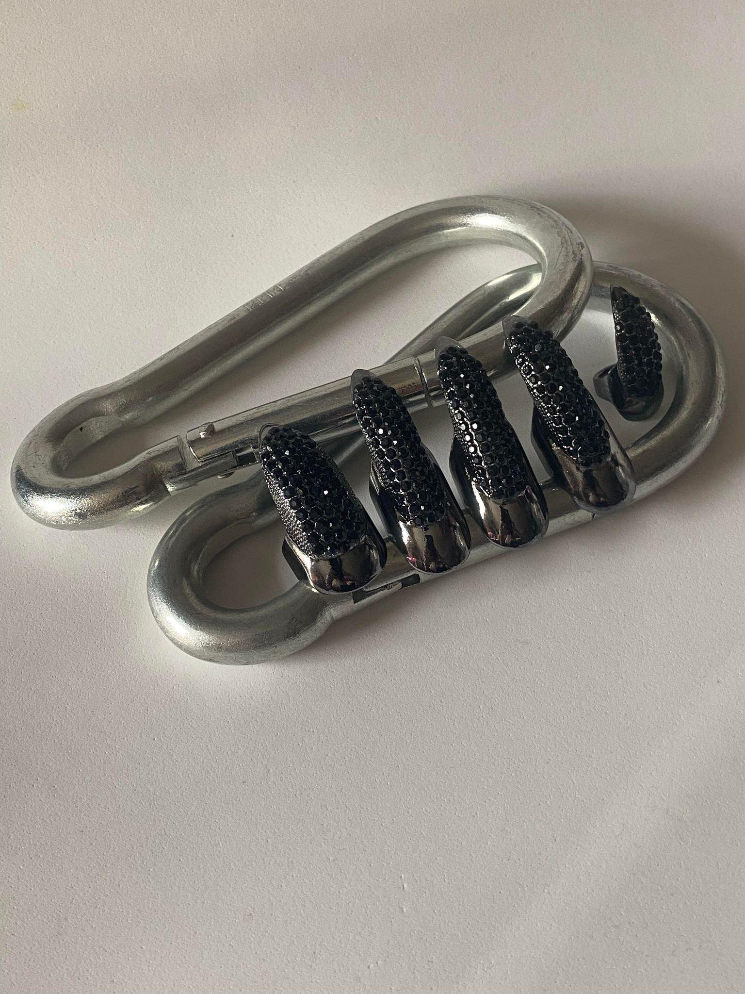 Crafted from strong lightweight sturdy metal with hand set black crystal nail point claws .