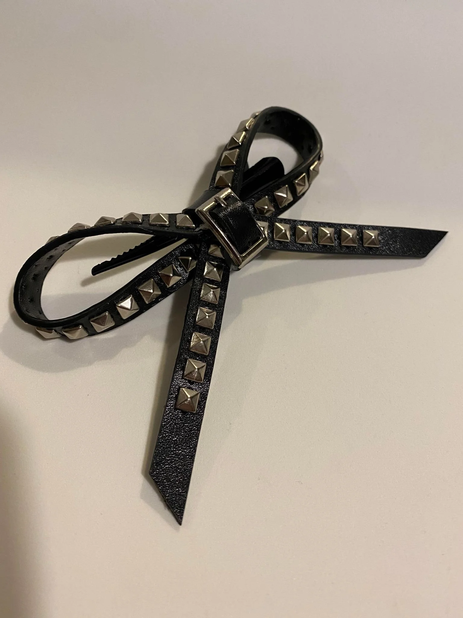 Measuring around 5 x 3 inches in size (each bow is unique so may differ slightly) formed from stiff vegi leather and punctured with chrome pyramid studs for an industrial kinky kitten look!,